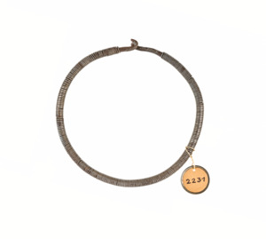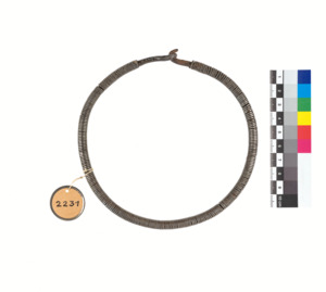 Ein zum Ring gebogener Draht mit zwei ineinandergreifenden Verschlusshaken. Der Ring ist mit einem Eisendraht umwickelt.