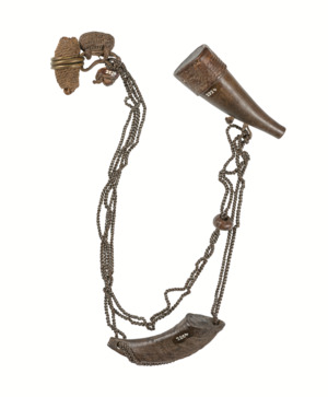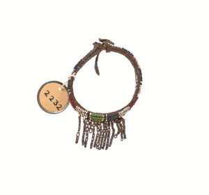 Lederarmband dekoriert mit drei bzw. vorne vier Perlreihen mit wechselnden Farbsegmenten (Seiten: weiß, blau, Front: grün, rot) über die gesammte Breite. In der untersten, vierten Reihe sind vorne die Eisenkettchen eingegliedert. Geschlossen wird das Armband hinten mit zwei Lederstreifen.