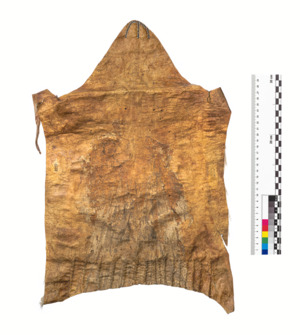 Fast quadratisches Lederstück, oben mit dreieckig zulaufendem Überschlag, dort auch spitz zulaufende Befestigungsenden an den Seiten, seitliche Fellstreifen, Perlenstickerei am Saum, Spitze des Überschlags ebenfalls bestickt.