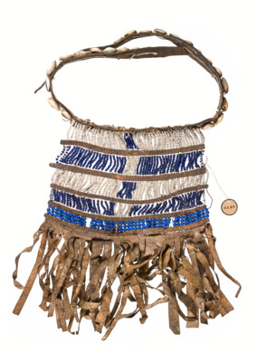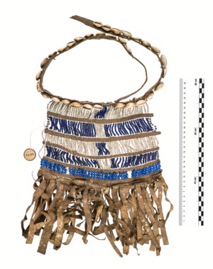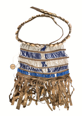 Längeres Lederband mit Muscheln, zwischen fünf Reihen mit Perlen fünf Lederstreifen, erste vier Reihen kleine blaue und weiße Perlen, fünfte Reihe größere blaue Perlen
