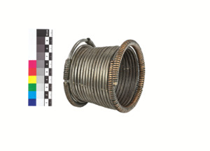 Armspirale aus 17 röhrenförmig gewickelten Spiralen, Enden mit Kupferdraht umwickelt, am Unterarm getragen. Alter Eintrag im Inv.-Buch: Von allen Frauen nach der Beschneidung bis zur Hochzeit getragen, mittlerweile werden die Armspiralen nach der Hochzeit verkauft.