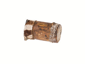 Zylinderförmige Holzdose mit einem Hautdeckel an jedem Ende (Zebra?)