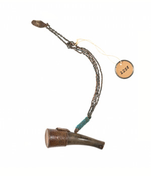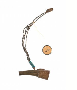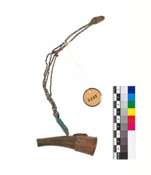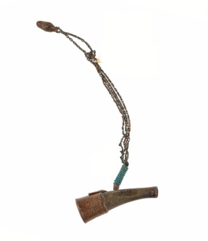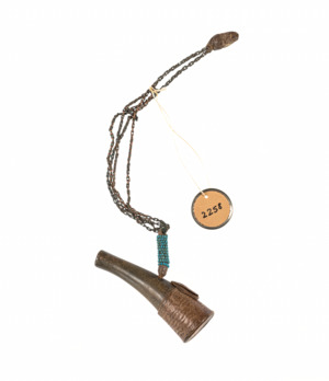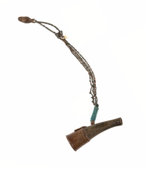 Nach oben verjüngtes Horn, zylindrischer Boden aus Leder, Befestigung: Lederstreifen umwickelt mit kleiner Perlenschnur, daran Kupferkette mit Lederstopfen