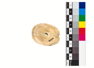 Ein runder Konusschneckenboden mit einem Loch in der Mitte. Laut Inventarbuch ist dieser Konusschneckenboden ein Teil eines Ohrgehänges.
