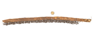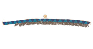 Gürtelvorderseite komplett mit Reihen von zweifarbigen Perlschnüren mit Zickzackmuster bedeckt, Kettenenden auf den Strang am unteren Rand mitaufgefädelt, bilden Fransen, Verschluss: Reste von Schnur in Löchern an beiden Enden