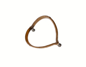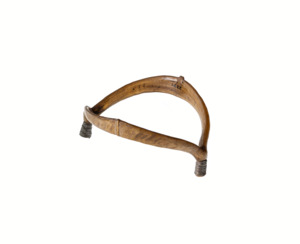 Ovaler Reif mit zwei hochstehenden, mit Draht umwickelten Enden, zwei geschnitzte schmale Stege quer zum Reif, die sich gegenüber stehen.