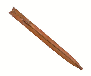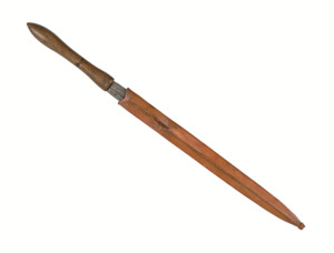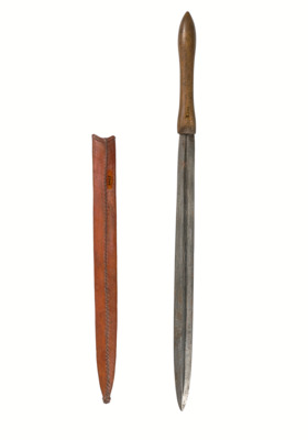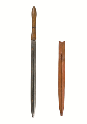 Zweischneidiger ca. 2,5 cm breiter Dolch mit rundem Holzgriff, Dolchscheide aus hellem Leder, das auf der Rückseite vernäht ist, an der Vorderseite eine eingearbeitete kleine Schlaufe.