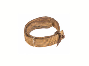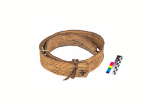 Leder der Länge nach in enge Falten zusammengelegt, sodass der Gürtel wie aus einzelnen dünnen Riemen zusammengesetzt aussieht. Verschluss: Ein Lederstreifen wird durch Löcher an den Enden gezogen und geknotet.