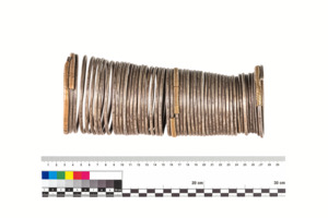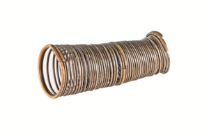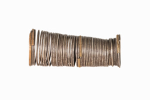 Spirale aus ca. 5 mm dickem Eisendraht, an den Enden und in der Mitte mit dünnem Kupferdraht umwickelt