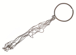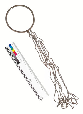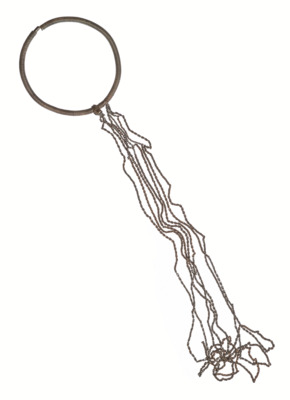 Halsreif komplett mit Kupferdraht umwickelt, vorne drei Ketten mit eiserner Klammer am Reif besfestigt, vier Ketten mit letztem Kettenglied direkt an Kupferdraht eingehängt, Verschluss: Reifende wird in überstehende Spirale eingesteckt.