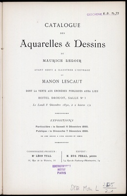Catalogue des aquarelles et dessins de Maurice Leloir ayant servi à illustrer L'ouvrage de Manon Lescaut : dont la vente aura lieu le 8 dec. 1890 Hotel Drouot