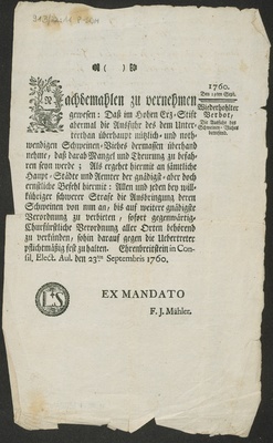 Nachdemahlen zu vernehmen gewesen: Daß im hohen Erz-Stift abermal die Ausfuhr des dem Unterthan überhaupt nützlich- und nothwendigen Schweinen-Viehes dermassen überhand nehme, daß darab Mangel und Theurung zu befahren seyn werde .... Ehrenbreitstein in Consil. Elect. Aul. den 23ten. Septembris 1760. / [Clemens Wenceslaus Churfürst]. Ex Mandato F. J. Mähler
