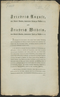Friedrich August, von Gottes Gnaden, souverainer Herzog zu Nassau [et]c. [et]c. und Friedrich Wilhelm, von Gottes Gnaden, souverainer Fürst zu Nassau [et]c. [et]c. In der Ueberzeugung, daß alles, was zur ungestöhrten Ausübung der Religion beyträgt, und den Keim zu Zwistigkeiten unter verschiedenen Religionsverwandten entfernt.... haben Wir Uns bewogen gesehen, zu verordnen, daß die Freyheit der Ehen zwischen den Verwandten der Römisch Katholischen - der Lutherischen und der Reformirten Religion in Unserem vereinten Herzogthum auf keine Art beschränkt seyn solle ... Gegeben Biebrich den 22ten und Weilburg den 26ten März 1808