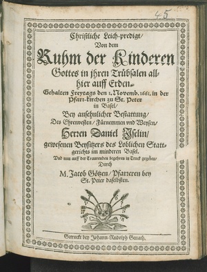 Christliche Leich-predigt/ Von dem Ruhm der Kinderen Gottes in ihren Trübsalen allhier auff Erden. : Gehalten freytags den 1. Novemb. 1661 in der Pfarr-kirchen zu St. Peter in Basel/ Bey ansehnlicher Bestattung/ des ... Herren Daniel Iselin/ gewesenen Beysitzers des Loblichen Stattgerichts im minderen Basel. / ... in Truck gegeben/ Durch M. Jacob Götzen/ Pfarreren bey St. Peter daselbsten