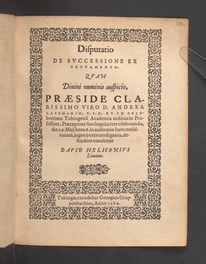 Disputatio DE SVCCESSIONE EX TESTAMENTO. QVAM ... PRAESIDE CLARISSIMO VIRO D.ANDREA LAVBMARIO.V.I.D.ET IN CELEberrima Tubingensi Academia ordinario Professore,Praeceptore suo ... die 29.Maij hora 6.in auditorio Iureconsultorum,ingenij exercendi gratia,defendere conabitur DAVID HELICONIVS Liuonus.