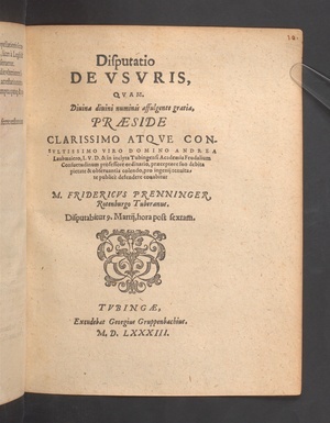 Disputatio DE VSVRIS, QVAM. ... PRAESIDE ... DOMINO ANDREA Laubmaiero,I.V.D.& in inclyta Tubingensi Academia Feudalium Consuetudinum professore ordinario ... publicè defendere conabitur M.FRIDERICVS PRENNINGER, Rotenburgo Tuberanus. Disputabitur 9.Martij,hora post sextam.