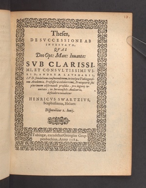 Theses, DE SVCCESSIONE AB INTESTATO. QVAS ... SVB CLARISSIMI ... VIRI D.ANDREAE LAVBMARII, I.V.D.feudalium consuetudinum,in inclyta Tubingensium Academia,Professoris ... praesidio ... defendere conabitur HENRICVS SWARTZIVS, Scaphusianus,Heluet: Disputabitur 2.Iunij.