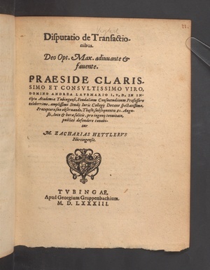 Disputatio de Transactionibus. ... PRAESIDE ... DOMINO ANDREA LAVBMARIO I.V.D. IN INclyta Academia Tubingensi, Feudalium Consuetudinum Professore celeberrimo, amplissimi Studij Iuris Collegij Decano ... Theses subsequentes 30.Augusti, loco et hora solitis ... publicè defendere conabitur M.ZACHARIAS HETTLERVS Nürtingensis.