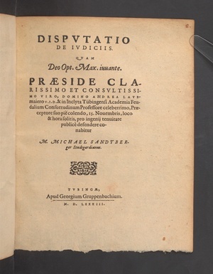 DISPVTATIO DE IVDICIIS. QVAM ... PRAESIDE ... DOMINO ANDREA LAVBmaiero V.I.D.& in Inclyta Tübingensi Academia Feudalium Consuetudinum Professore ... 15.Nouembris, loco & hora solitis ... publicè defendere conabitur M.MICHAEL SANDTBERger Studtgardianus.