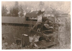 Ruine Hochofen und Dach der Gießhalle der Sayner Hütte 1974