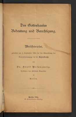 Des Gotteshauses Bedeutung und Berechtigung : Weiherede, gehalten am 4. September 1904 bei der Einweihung der Gemeindesynagoge in der Rykelstraße / von Dr. Adolf Rosenzweig (Rabbiner der jüdischen Gemeinde zu Berlin)