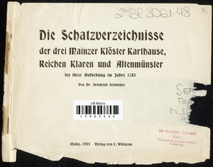 Die Schatzverzeichnisse der drei Mainzer Klöster Karthause, Reichen Klaren und Altenmünster bei ihrer Aufhebung im Jahre 1781 / von Friedrich Schneider