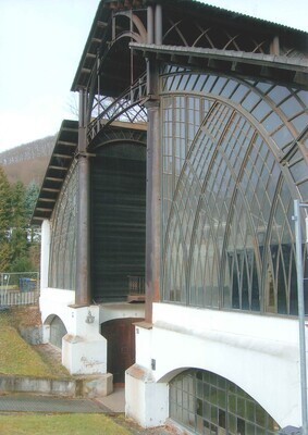 Gießhalle der Sayner Hütte, erhöhtes Mittelschiff, Westfassade