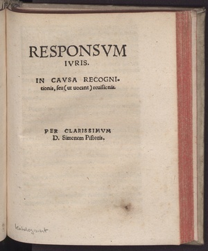 RESPONSVM || IVRIS.|| IN CAVSA RECOGNI=||tionis, seu (ut uocant) reuisionis.|| PER CLARISSIMVM || D. Simonem Pistoris.||