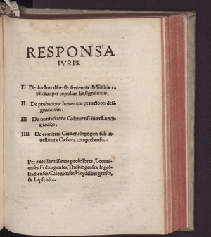 RESPONSA || IVRIS.|| I De duobus diuersis sententiae definitiuae ca||pitibus, per copulam Et, significatis.|| II De probatione bonorum per actores desi=||gnatorum.|| III De transactione Coloniensi inter Landt||grauios.|| IIII De comitatu Catzenelnpogen sub in=||uestitura Caesarea comprehenso.|| Per excellentissimos professores, Louani=||enses, Friburgenses, Thubingenses, Ingol=||stadienses, Colonienses, Heydelbergenses,|| & Lipsenses.||