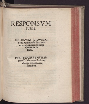 RESPONSVM || IVRIS.|| IN CAVSA LIQVIDA=||tionis Nassauiensis, super qua=||tuor articulis per academias || Germaniae de||finitis.||| PER EXCELLENTISSI=||mum D. Marianum Sozinum || aliorum responsa con=||firmantem ||