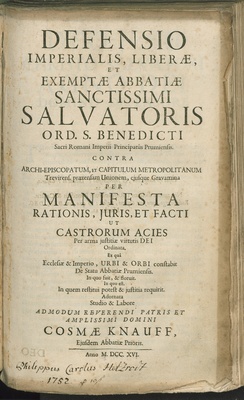 Defensio Imperialis, Liberae et exemptae Abbatiae Sanctissimi Salvatoris ord. S. Benedicti Sacri Romani Imperii Principatûs Prumiensis : Contra Archi-Episcopatum, et Capitulum Metropolitanum Trevirens. praetensam unionem, ejusque gravamina per manifesta rationis, juris, et facti ut castrorum acies per arma justitiae virtutis Dei ordinata ; Ex quâ Ecclesiae & Imperio, Urbi & Orbi constabit De Statu Abbatiae Prumiensis ; In quo fuit, & floruit ; In quo est ; In quem restitui potest & justitia requiririt / Adornata studio & labore admodum Reverendi Patris et Amplissimi Domini Cosmae Knauff, ejusdem Abbatiae Prioris
