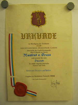 Urkunde Hechtsheimer Dragoner Garde 1990 - Manfred v. Grass zum Oberst Baron von Steuern und Tabellen