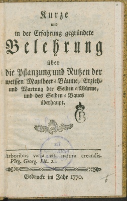 Kurze und in der Erfahrung gegründete Belehrung über die Pflanzung und Nutzen der weissen Maulbeer-Bäume, Erzieh- und Wartung der Seiden-Würme, und des Seiden-Baues überhaupt