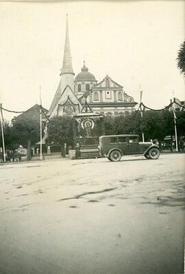 Foto Arbeiter mit Pferd beim Spritzen oder Stäuben