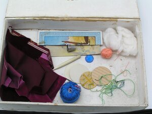 Schachtel mit Näh- und Bastelutensilien für die Herstellung von Devotionalien