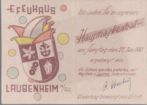 Einladung Karneval-Gesellschaft ULK Mainz-Laubenheim 1951 - Hausmaskenball Efeuhaus Laubenheim