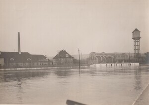 Hochwasser im Rheinhafen Bendorf, amerikanisches Militärdepot 1920