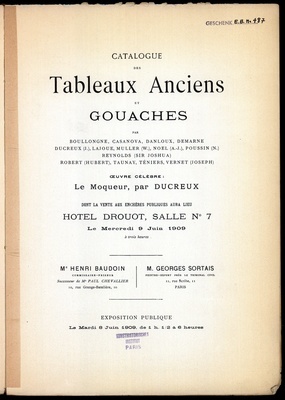 Catalogue des tableaux anciens et gouaches : par Boullongne, Casanova, Danloux, Demarne [und weiteren] : œuvre célèbre: Le Moqueur, par Ducreux : dont la vente aux enchères publiques aura lieu Hôtel Drouot, Salle No 7, le mercredi 9 juin 1909 / Henri Baudoin, commissaire-priseur, successeur de Paul Chevallier ; Georges Sortais, peintre-expert près le tribunual civil