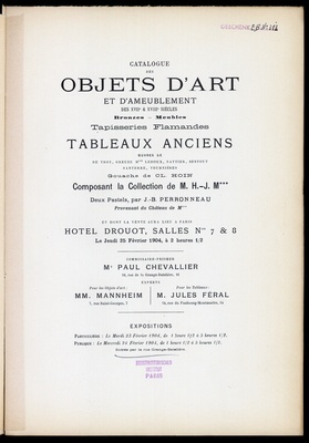 Catalogue des objets d'art et d'ameublement : des XVIIe & XVIIIe siècles : bronzes, meubles, tapisseries flamandes : tableaux anciens : œuvres de: de Troy, Greuze, Mlle Ledoux, Nattier, Restout, Santerre, Tournières : gouache de Cl. Hoin : composant la Collection de M. H.-J. M*** : deux pastels par J.-B. Perronneau : provenant du Château de M*** : et dont la vente aura lieu à Paris, Hôtel Drouot, Salles Nos 7 & 8, le jeudi 25 février 1904 / commissaire-priseur: Paul Chevallier ; experts pour les objets d'art M. Mannheim, pour les tableaux Jules Féral