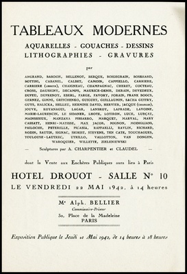 Tableaux modernes : aquarelles, gouaches, dessins, lithographies, gravures : par: Angrand, Bardon, Bellenot, Berque, Boigegrain, Bosshard [und weitere] : sculptures par A. Charpentier et Claudel : dont la vente aux enchères publiques aura lieu à Paris, Hôtel Drouot, Salle No 10, le vendredi 22 mai 1942 / Me Alph. Bellier, commissaire-priseur