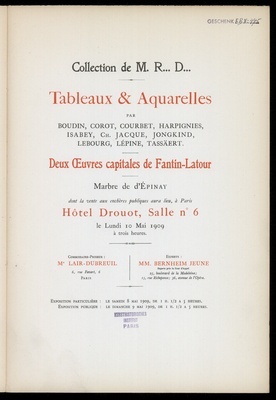 Tableaux & aquarelles : par Boudin, Corot, Courbet, Harpignies [und weitere] : collection de M. R... D... : deux œuvres capitales de Fantin-Latour : marbre de d'Épinay : dont la vente aux enchères publiques aura lieu à Paris, Hôtel Drouot, Salle No 6, le lundi 10 mai 1909 / commissaire-priseur Me Lair Dubreuil ; experts MM. Bernheim Jeune, experts près la Cour d'Appel