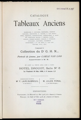Catalogue des tableaux anciens : par Bachelier, F. Boucher, Breughel, Chardin [und weiteren] : composant la Collection du Dr. G. H. N... : portrait de femme par Carle van Loo : appartenant à M. X... : et dont la vente aura lieu à Paris, Hôtel Drouot, Salle No 6, le vendredi 29 mai 1908 / commissaire-priseur F. Lair Dubreuil ; expert Jules Féral