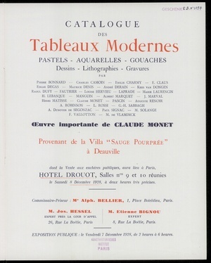 Catalogue des tableaux modernes : pastels, aquarelles, gouaches : dessins, lithographies, gravures : par Pierre Bonnard, Charles Camoin, Emile Charmy, E. Claus [und weiteren] : œuvre importante de Claude Monet : provenant de la Villa "Sauge Pourprée" à Deauville : dont la vente aux enchères publiques aura lieu à Paris, Hôtel Drouot, Salles Nos 9 et 10 réunies, le samedi 8 décembre 1928 / commissaire-priseur Alph. Bellier ; Jos. Hessel, expert près la Cour d'Appel, Ètienne Bignou, expert