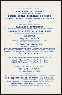 Tableaux modernes : I. Provenant de la collection de Monsieur X... : tableaux modernes : par Forain, Lebourg, Vogler : objets d'art d'Extrême-Orient : céramique, bronzes, soieries, laques & bois incrusté : II. Appartenant à divers amateurs : tableaux modernes : par Antral, Boudin, Camoin, Degas, Lebasque, Moret, Veron etc.... : gravures des écoles française, hollandaise, etc... : céramique : objets variés : miniatures, éventails, ivoires, argenterie, cristaux, pendules, bronzes, glaces : sièges & meubles : anciens & modernes : paires de chaises gondoles en acajou, fauteuils des époques Régence & Louis XVI, mobilier de salon en acajou XIXe siècle, secrétaires, médailler, paire d'encoignures, buffets, armoires, clavecin fin XVIIIsle : étoffes, tapis : dont la vente aux enchères publiques aura lieu Hôtel Drouot, le lundi 29 novembre 1943, Salle No 6, le mardi 30 novembre 1943, Salle No 7 / commissaire-priseur: J.-Ph. Bondu ; assisté de: Pour les tableaux modernes J. Dubourg, expert, pour les les objets d'Extrême-Orient M. Tournet, expert près les douanes françaises, pour les meubles et objets d'art B. Dillée, expert près le Tribunal civil de la Seine