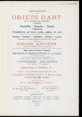 Catalogue des objets d'art et d'ameublement anciens : aquarelles, gouaches, dessins : tableaux : sculptures en terre cuite, plâtre et cire : par ou attribués à Clodion, Falconet, Marin, Lucas Montigny : bronzes, pendules, appliques, chenets, lustres : statuette en bronze florentin patiné du XVIe siècle : écrans : sièges anciens : des époques Régence, Louis XV et Louis XVI : par P. Bernard, M. Budin [und weiteren] : sièges garnis d'ancienne tapisserie : meubles en marqueterie et acajou : du XVIIIe siècle : plusieurs portant les estampillés des maîtres-ébénistes : D. Genty, C. Mauter [und weiteren] : tapisseries anciennes : des Flandres et d'Aubusson : appartenant à Madame G... : et dont la vente aux enchères publiques aura lieu à Paris, Galerie Georges Petit, 8, rue de Sèze, le jeudi 3 avril 1930 / commissaire-priseur: F. Lair Dubreuil ; experts pour les objets d'art Georges B.-Lasquin, pour les dessins et tableaux Jean Cailac