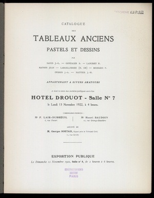 Catalogue des tableaux anciens : pastels et dessins : par David J.-L., Gonzales B., Lancret N. [und weiteren] : appartenant à divers amateurs : et dont la vente aux enchères publiques aura lieu Hôtel Drouot, Salle No 7, le lundi 13 novembre 1922 / commissaires-priseurs F. Lair Dubreuil, Henri Baudoin ; assisté de Georges Sortais, expert-peintre près le tribunual civil