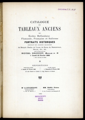 Catalogue des tableaux anciens : des Écoles hollandaise, flamande, française et italienne : portraits historiques provenant des anciennes collections de Marquis Charles de Valori, du Baron de Beurnonville, Sellar, etc. etc. : dont la vente aura lieu Hôtel Drouot, Salle No 8, le lundi 15 février 1892 / G. Duchesne, commissaire-priseur ; Haro frères, peintres-experts