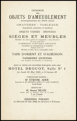 Catalogue des objets d'ameublement : principalement du XVIIIe siècle : gravures, tableaux : argenterie ancienne et moderne : objets variés, bronzes : sièges et meubles : moblilier de salon garnie de tapisserie "Aux Pavots" de style Louis XIV : commodes d'époque Régence : sécretaire en marqueterie de Landrin, époque Louis XV : meuble d'entre deux estampillé Leleu : tapis d'Orient et d'Aubusson : tapisseries anciennes des Flandres, de Bruxelles et d'Aubusson : dont la vente aux enchères publiques aura lieu Hôtel Drouot, Salle No 1 le jeudi 28 mai 1942 / commissaire-priseur: Étienne Ader, successeur de Maurice Ader et F. Lair Dubreuil ; assisté de: Bernard Dillée, expert près le Tribunal civil de la Seine