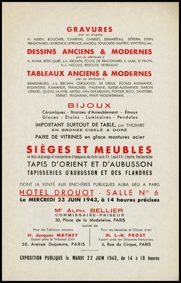 Gravures : par ou après H. Alken, Boucher, Chardin, Charlet, Demarteau, Déveria, Eisen, Fragonard, Lavreince, Leprince, Madou, Toulouse-Lautrec, Watteau, etc. : dessins anciens & modernes : par ou attribués à: V. Adam, Béricourt, J.-L. Brown [und weitere] : tableaux anciens & modernes : par ou attribués à: Brakenburg, J.-L. Brown, Cerquozzi [und weitere] : bijoux : céramiques, bronzes d'ameublement, émaux, glaces, étains, luminaires, pendules : important surtout de table, par Thomire en bronze ciselé & doré : paire de vitrines en glace montures acier : sièges et meubles en bois de placage et marqueterie d'époque ou de style Louis XV, Louis XVI, Empire, Restauration : tapis d'Orient et d'Aubusson : tapisseries d'Aubusson et des Flandres : dont la vente aux enchères publiques aura lieu à Paris, Hôtel Drouot, Salle No 6 le mercredi 23 juin 1943 / Me Alph. Bellier, commissaire-priseur ; assisté de: Pour les tableaux anciens Jacques Mathey, expert près le Tribunal civil, pour les meubles et objets d'art L.-H. Prost, expert près les douanes françaises