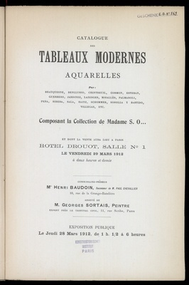 Catalogue des tableaux modernes : aquarelles : par Beauquesne, Benllurio, Chinetreuil, Cormon, Esteban [und weitere] : composant la Collection de Madame S. O.... : et dont la vente aura lieu à Paris, Hôtel Drouot, Salle No 1, le vendredi 29 mars 1912 / commissaire-priseur Henri Baudoin, successeur de Paul Chevallier ; assisté de Georges Sortais, peintre
